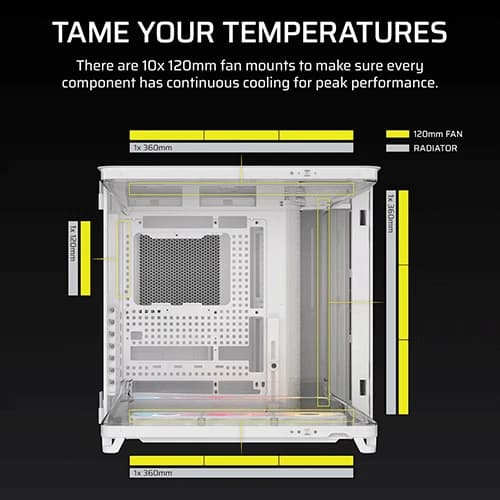 | Maximum Fan Support | Top: up to 3 × 120 mmFront: up to 3 × 120 mmBottom: up to 3 × 120 mmRear: 1 × 120 mm |