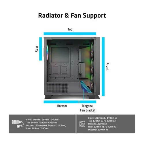 | Radiator Support (Rear/Bottom) | 120/140 mm |