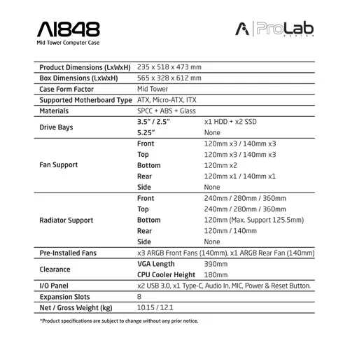 | Model Name | ProLab Design AI848 ARGB ATX Mid Tower Case |
