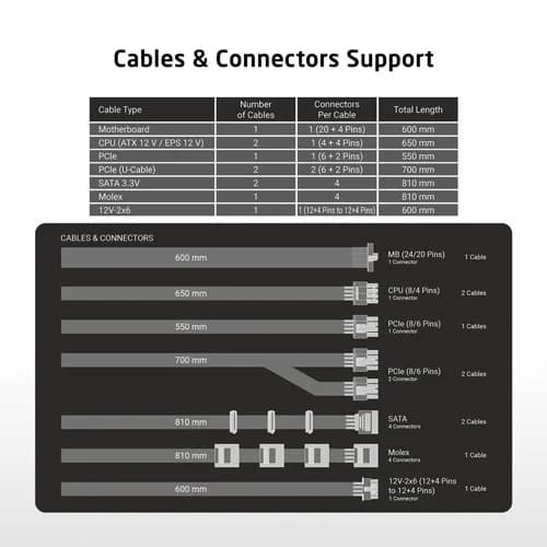 Connectors (Approx.) • ATX 24‑pin ×1• EPS (4+4) ×2• PCIe (6+2) ×5• PCIe 12VHPWR (16‑pin) ×1• SATA ×8• Molex ×4